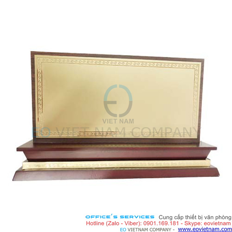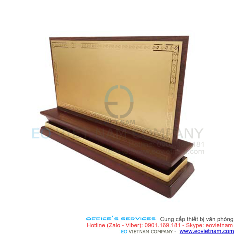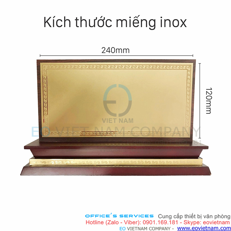 Bảng chức danh để bàn đế gỗ mặt inox có kích thước đế 60 x 275mm, thân 125 x 250 mm, bảng inox 120 x 240 mm