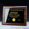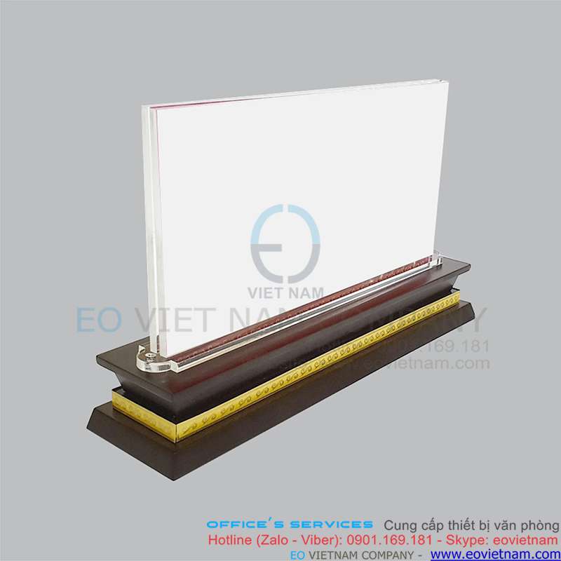 Bảng chức danh để bàn đế gỗ mặt mica có kích thước đế 60 x 275mm, bảng mica 120 x 240 mm, mica dày 5mm x 2