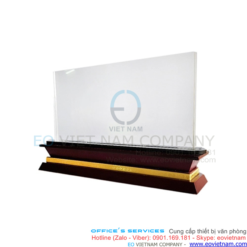 Bảng chức danh để bàn đế gỗ mặt mica có kích thước đế 60 x 275mm, bảng mica 120 x 240 mm, mica dày 5mm x 2