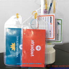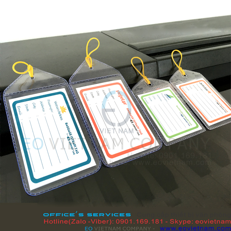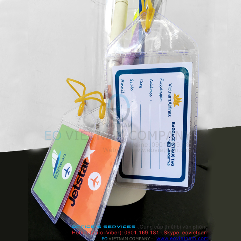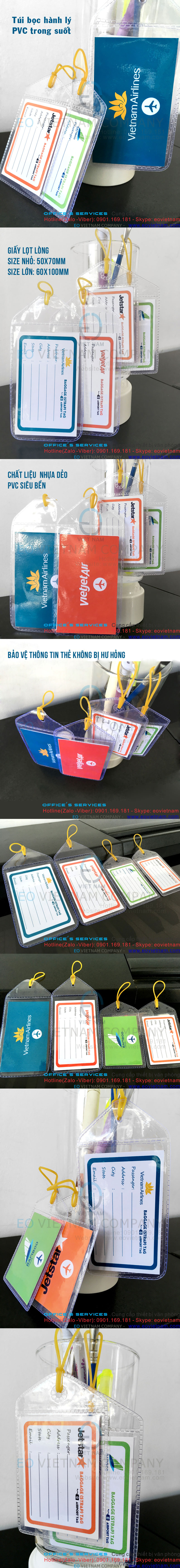 Bọc thẻ hành lý – Bọc thẻ hàng hóa – Name Tag – Baggage Tag là túi nhựa dẻo PVC bọc các thẻ thông tin hành lý, thẻ thông tin hàng hóa, nhằm mục đích bảo quản nội dung thông tin trong thẻ không bị hư hỏng, ẩm ướt trong quá trình vận chuyển trên quảng đường xa xôi. Chất liệu nhựa dẻo PVC trong suốt giúp hiện thị rõ ràng thông tin cần thiết của thẻ thông tin cần bao bọc. Ngoài ra Bọc thẻ hành lý – Bọc thẻ hàng hóa – Name Tag – Baggage Tag còn là một hình thức để quảng bá thương hiệu của Công ty, thể hiện được sự chuyên nghiệp, trang trọng đối với đối tác, khách hàng.