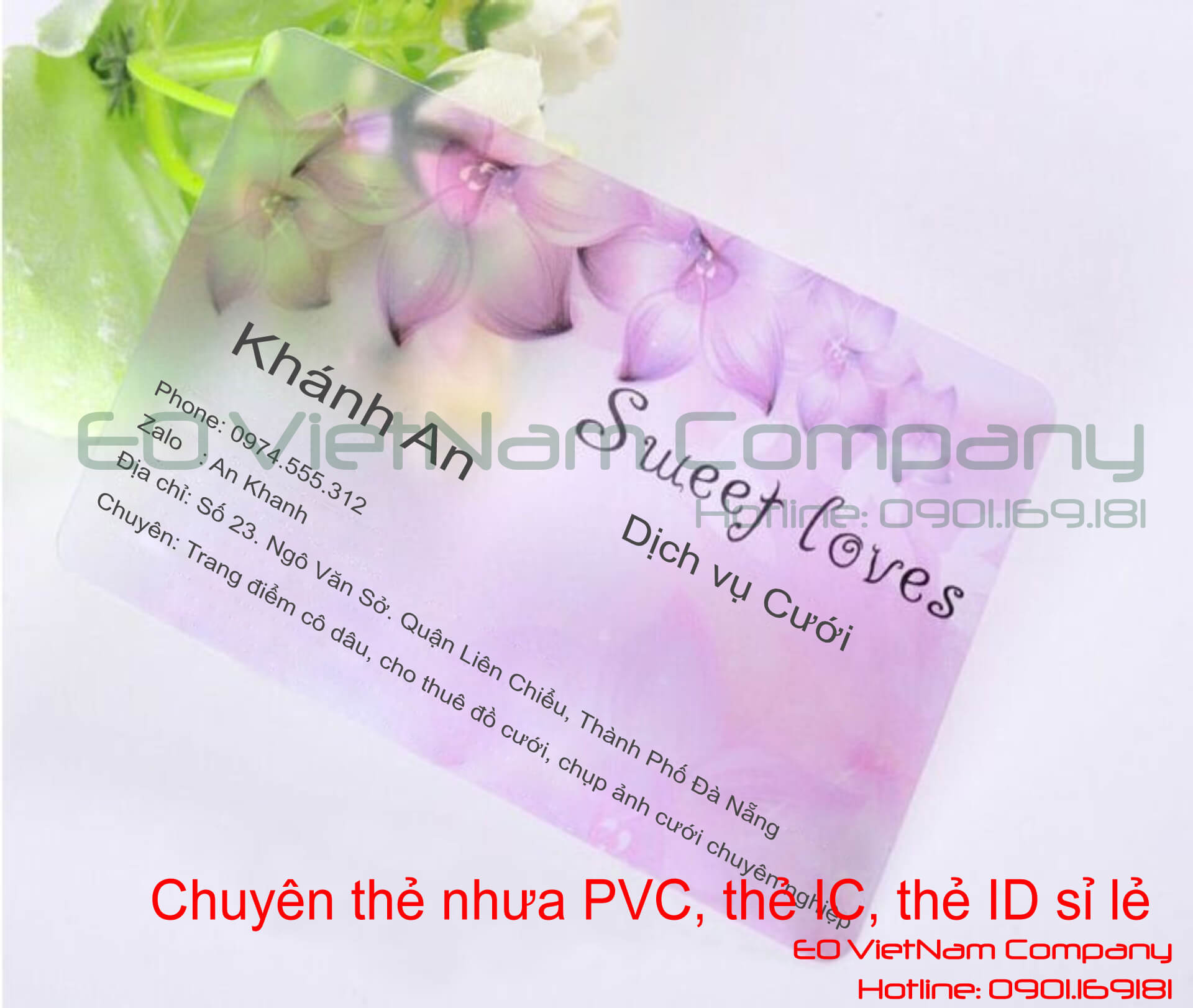 Chuyên in thẻ nhựa trong suốt, name card nhựa trong suốt cao cấp nhanh đẹp, giá rẻ và nhất là khỏi lo về chất lượng. Chất liệu: Nhựa dẻo trong suốt. Kích thước: 5.4×8.5 cm. Dày 0.38mm In nhiều màu siêu nét. Bền bỉ với môi trường, phòng nước, không phai màu. Thời gian nhận hàng: 5 đến 7 ngày.