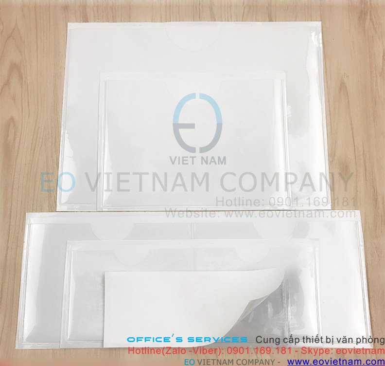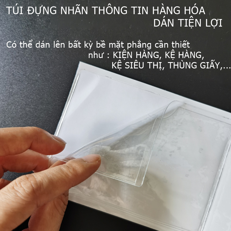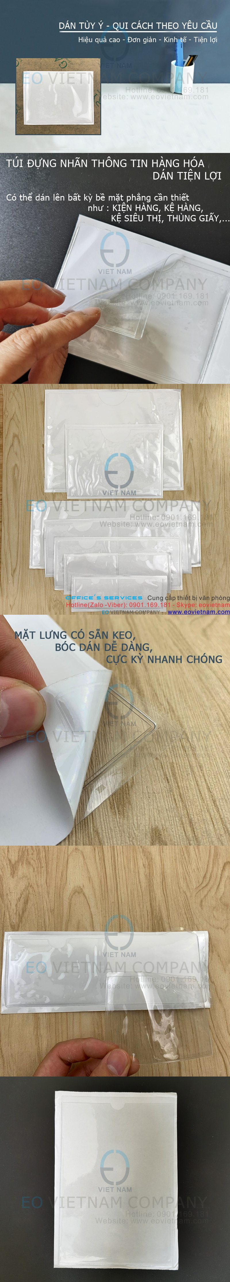 Túi đựng nhãn thông tin hàng hóa – Dán tiện dụng – Trong suốt là túi nhựa dẻo PVC dùng để chứa các nhãn thông tin sản phẩm, thông tin hàng hóa. Nhằm đáp ứng nhu cầu sử dụng nhanh chóng, tiện lợi trong quá trình biểu thị thông tin hàng hóa, nội dung thông tin thay đổi thường xuyên, giá thành rẻ chúng tôi sản xuất ra Túi đựng nhãn thông tin hàng hóa – Dán tiện dụng – Trong suốt bằng cách chọn dùng chất liệu nhựa dẻo PVC trong suốt, mặt lưng của túi có sẵn lớp keo dán giúp người dùng có thể nhanh chóng bóc dán ở bất kỳ vị trí nào mong muốn.