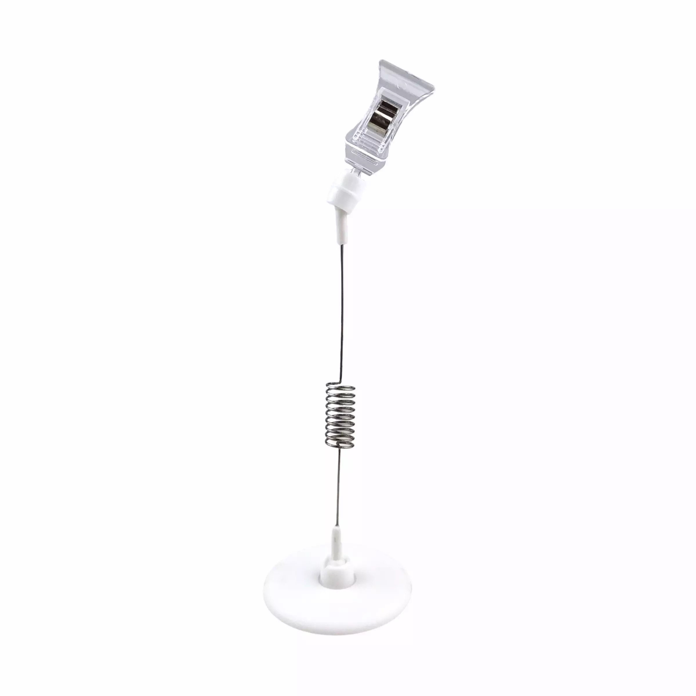 Wobbler để bàn – Wobbler lò xo kẹp nhựa 004 có đế được là bằng nhựa, thân dạng lò xo thép, đầu kẹp nhựa trắng trong suốt
